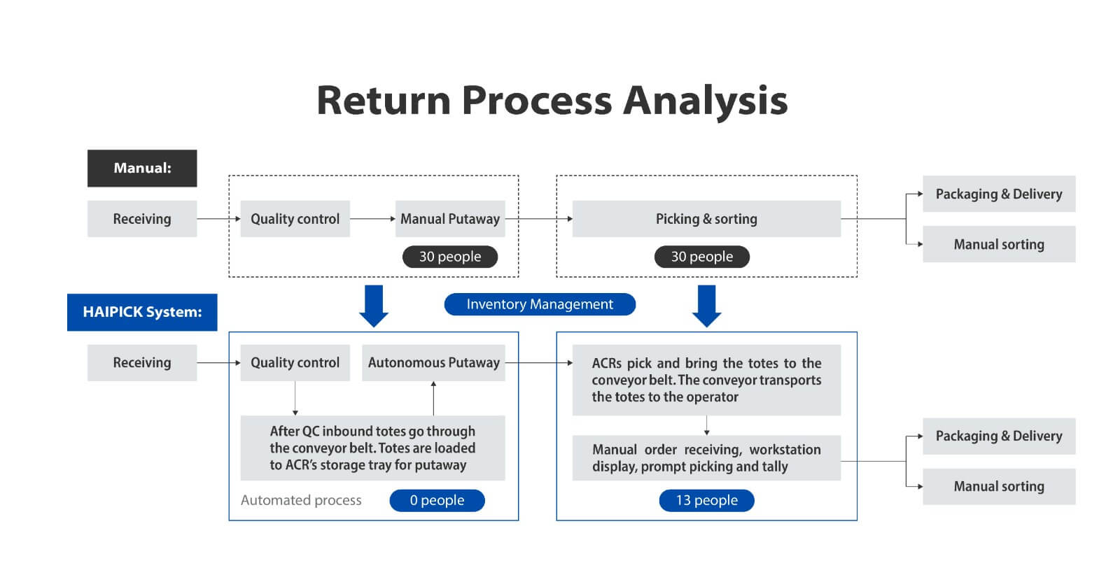 Sebelum pengautomatan, syarikat ini mengendalikan pengembalian secara manual, termasuk proses penyusunan semula, pengambilan, dan penyusunan semula. Perlu diperhatikan bahawa 30 FTE diperlukan untuk penyusunan semula dan 30 FTE diperlukan untuk pengambilan dalam operasi manual sebelum ini.