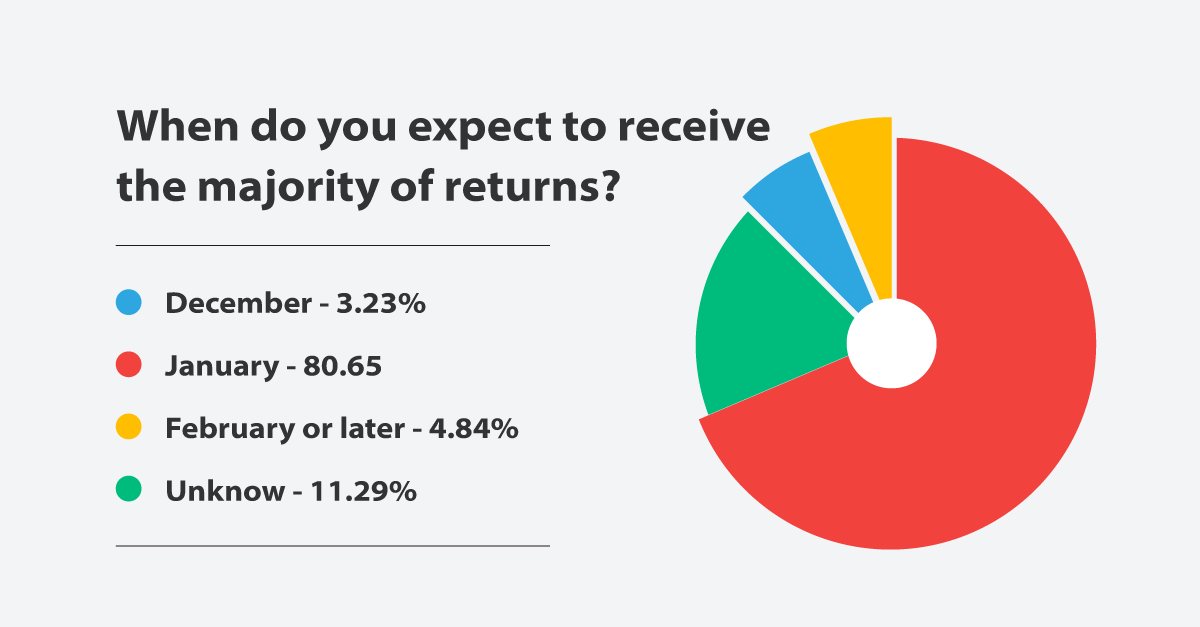 Tidak menghairankan, jumlah pulangan mencapai puncaknya semasa musim perayaan. MenurutShopify separuh daripada pembeli semasa musim perayaan membeli barang dengan niat untuk mengembalikannya pada tarikh kemudian. Sama ada hadiah yang tidak disukai oleh rakan atau cuba mendapatkan semula sebahagian wang yang mereka belanjakan dalam pembaziran yang dipengaruhi oleh musim perayaan, itulah sebabnya mengapa jenama e-dagang menerima pulangan yang paling banyak sepanjang Disember, Januari, dan Februari.